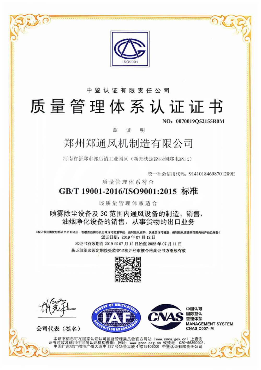 質(zhì)量管理體系認(rèn)證證書